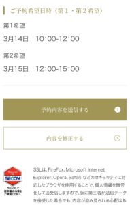 ⑦入力内容に相違が無いか確認し「予約内容を送信する」のボタンをタップ。